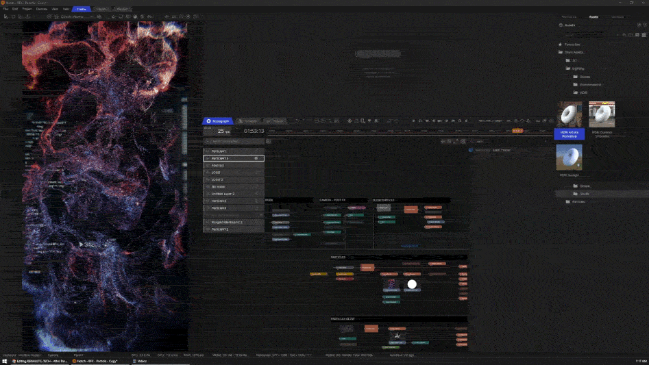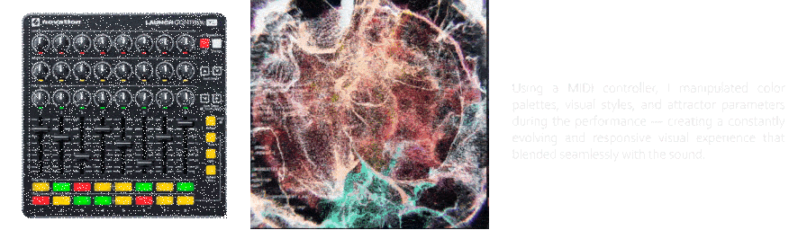 The system enabled manual control over parameters such as particle intensity, color modulation, and camera dynamics, allowing the visuals to respond both procedurally and performatively to the artist’s music.